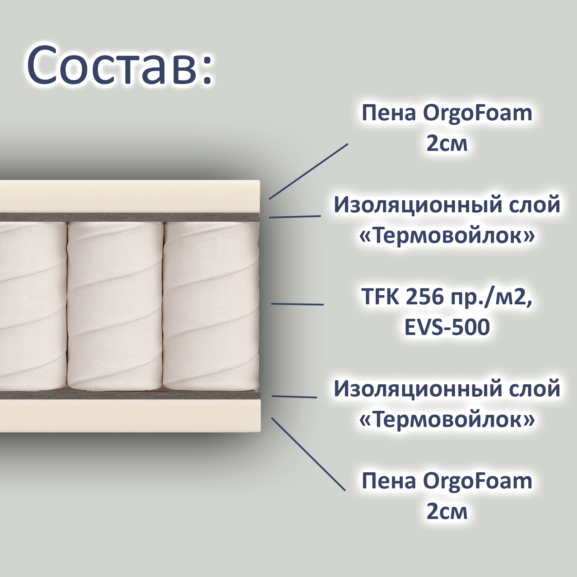 - Следующий слой – Термовойлок, надежный барьер из прочного предотвращающий проникновение пружин блока в мягкие материалы верхнего слоя и продлевающего срок службы изделия.