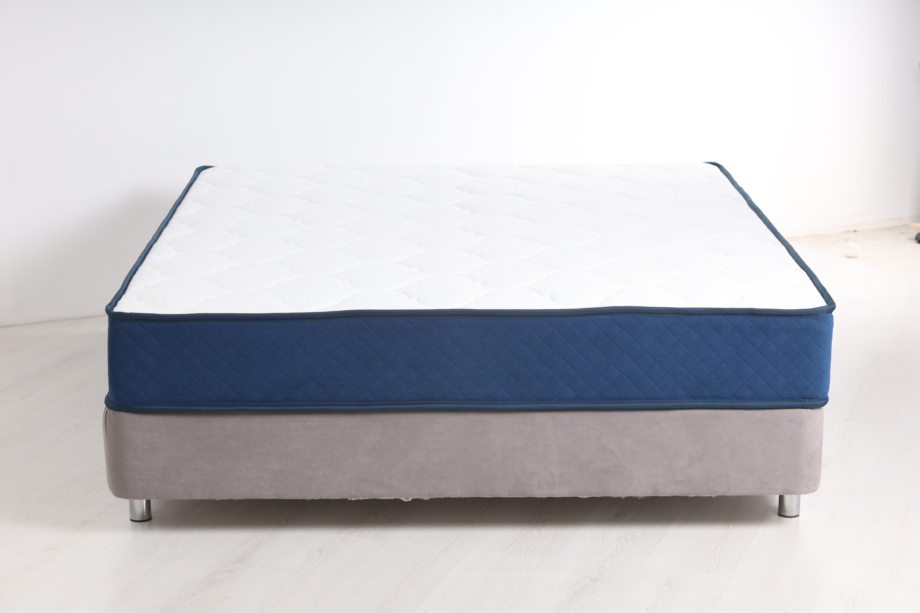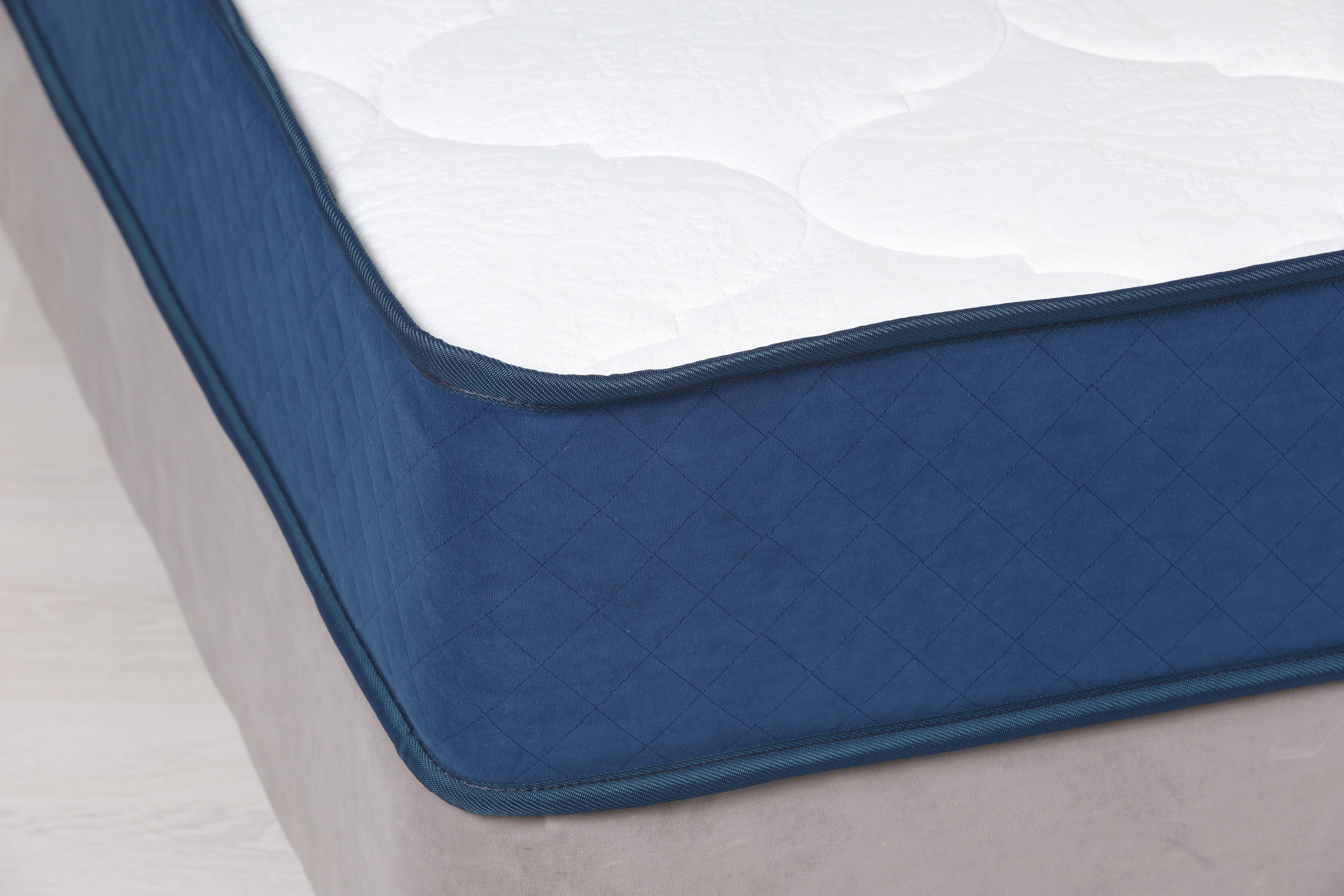 Покрытие выполнено из премиального турецкого трикотажа, в сочетании с боковой частью, изготовленной из синего мебельного велюра EVA. Это сочетание материалов обеспечивает долговечность, эстетичный внешний вид и комфортный микроклимат во время сна.