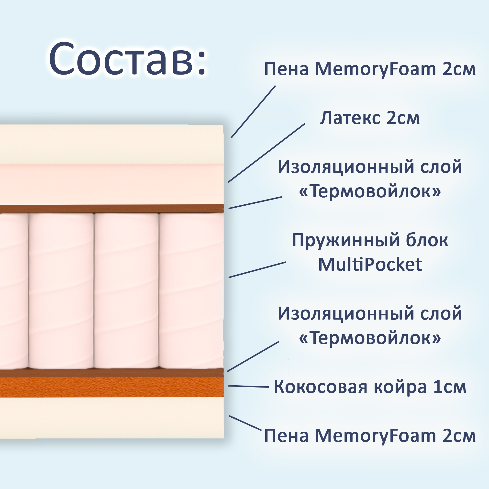- Независимый пружинный блок MultiPocket — каждая пружинка работает автономно, точно реагируя на изменения веса и положения тела.